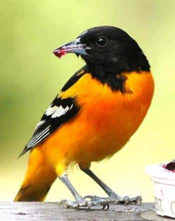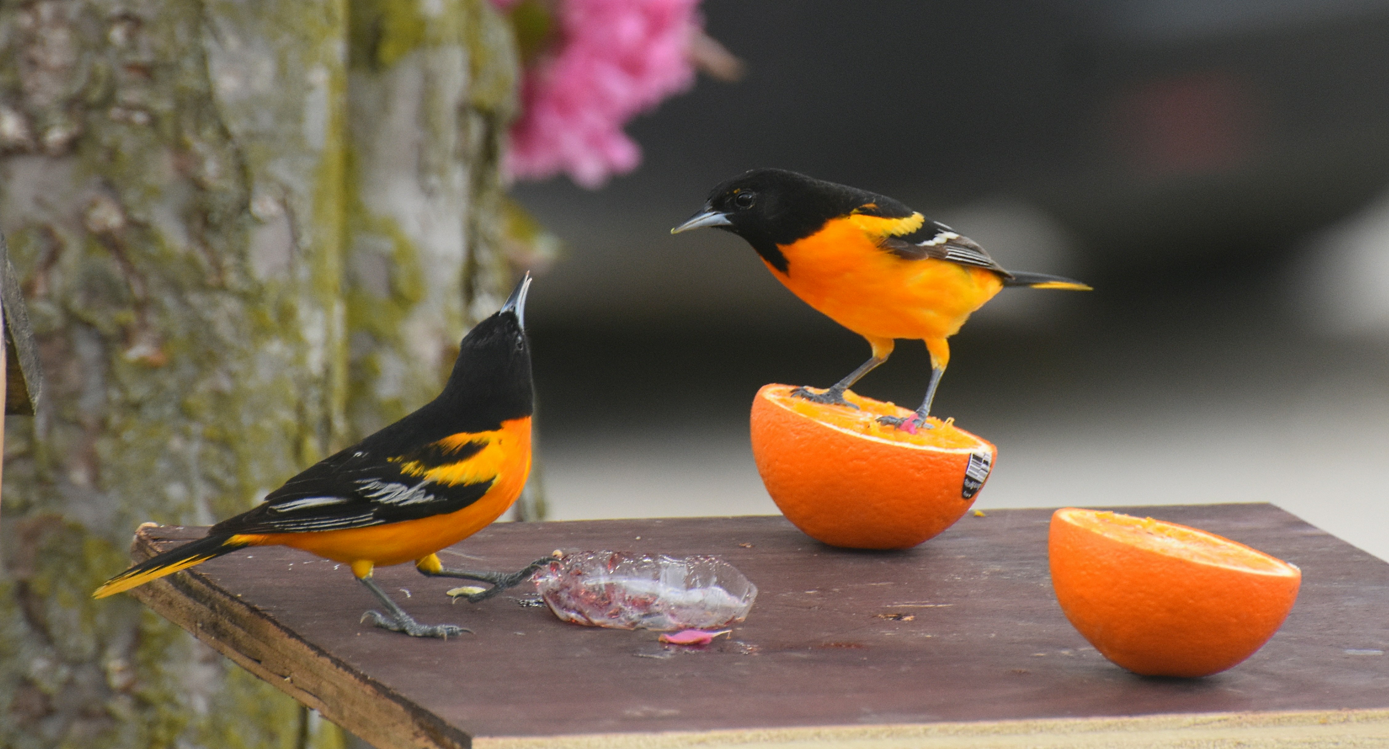 These pretty blackbirds have beautiful, obvious coloring. Its range stretches from alaska to the southern united states, and it migrates through canada and mexico during the winter months. Females of the two species are very similar. Males have glossy black heads with flamey orange hues on the belly and lower back. They may also stop for a drink at birdbaths.